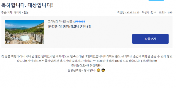 투투에이전시 신 ㅇ상 가이드님 참좋은 칭찬글 최고관리자 2023-01-17 조회 3,164 본문 목록 이전글투투에이전시 신 ㅇ상 가이드님 참좋은 칭찬글 23.01.17 다음글투투에이전시 김 ㄴ훈 가이드님 참좋은 칭찬글 23.01.17 댓글목록 댓글목록 등록된 댓글이 없습니다.
